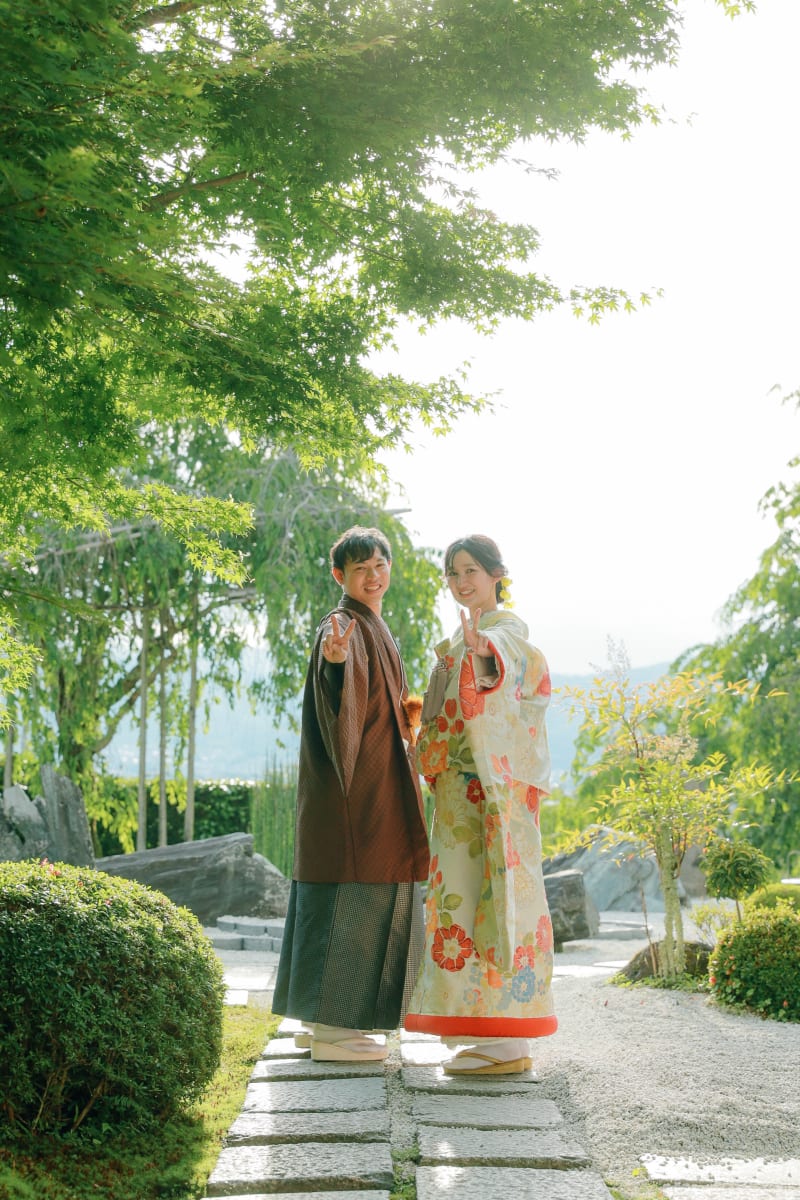 古くからの趣が残る庭園を歩く新郎新婦様、その姿は圧巻でした。