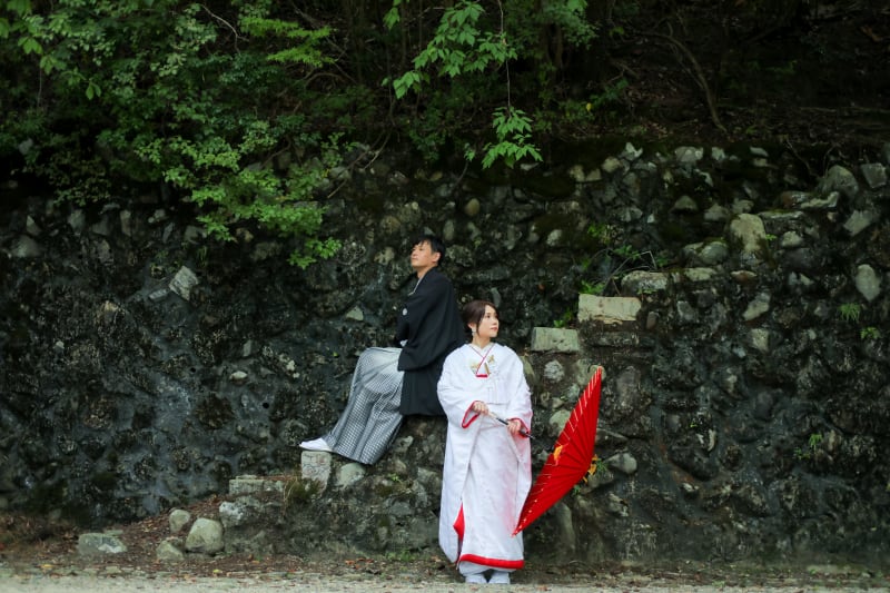 石垣を背景に、和傘を使ったポージングにも挑戦しました。