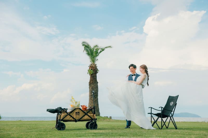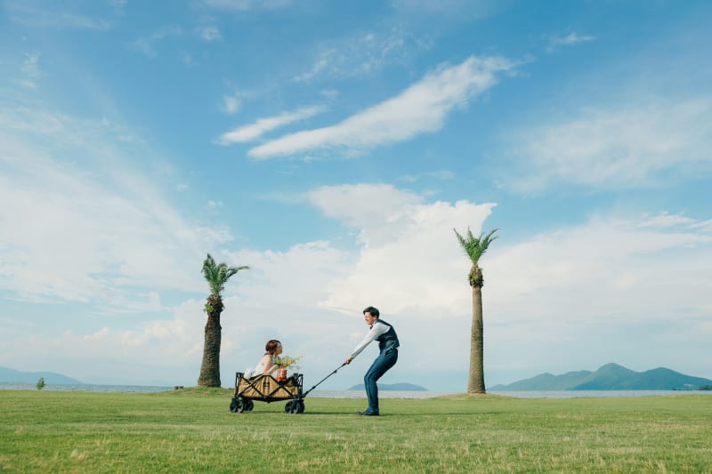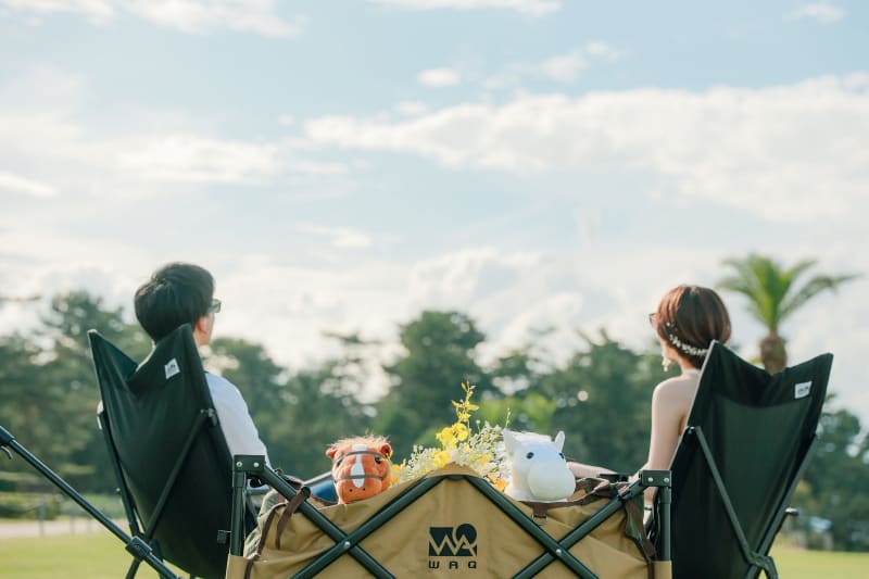 マイアミ浜は、青い空と瑞々しい緑、そして南国を思わせる美しい木々が揃った、まるで海外のリゾート地のような場所です。そんな素敵なロケーションで、お二人はキャンプグッズを活かしながら、楽しく撮影を楽しんでいただきました。