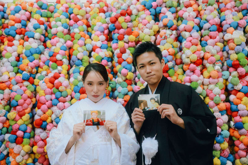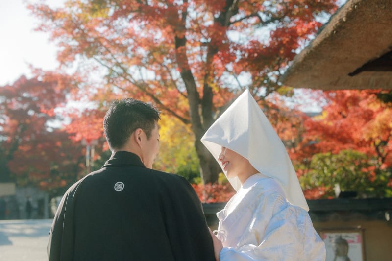 荘厳な建物をバックに、白無垢姿の新婦様と紋付の新郎様がひときわ美しく映えます。