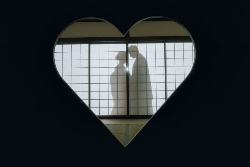 ハートの中に浮かぶお二人のシルエットは、まるでロマンチックな絵画のようで、見る人の心を温かく包み込みます。
