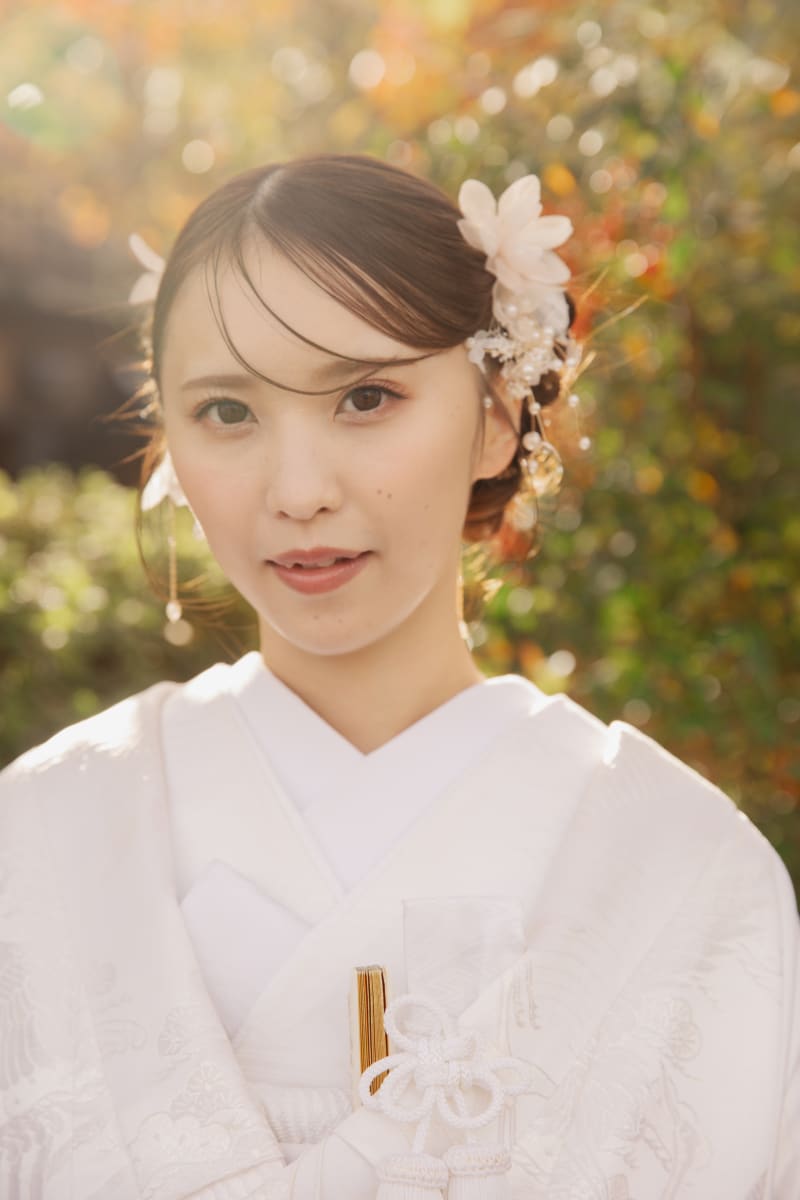 秋色の背景に白無垢が映え、上品で印象的な一枚となりました。