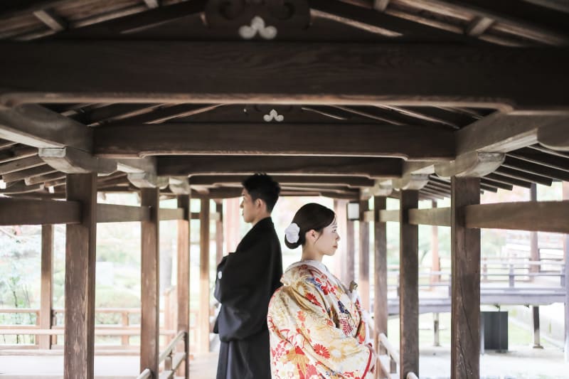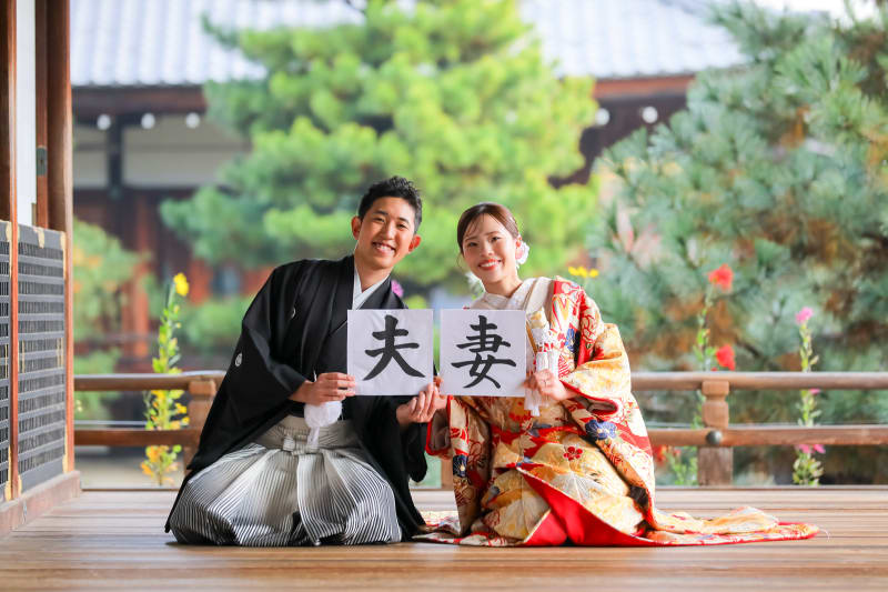 和装ならではの正座写真もお二人の工夫で可愛く仕上がりました。大覚寺の雰囲気も伝わる素敵な写真です。