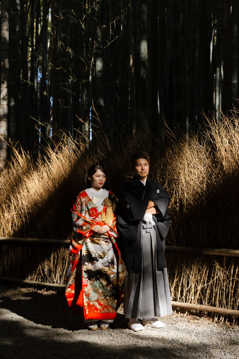 鮮やかな色打掛に身を包んだ新婦様と、紋付をお召しになった新郎様が並ぶと