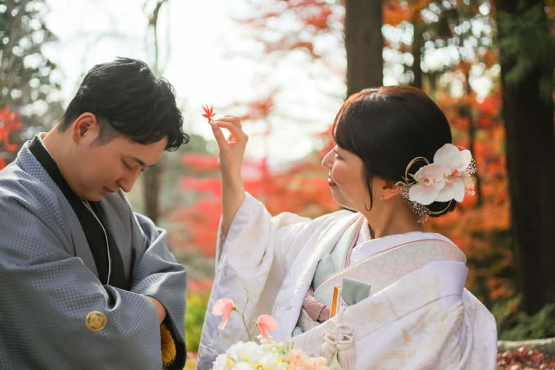 新郎様の髪にのった紅葉を新婦様が取る、そんな素敵なワンシーンが撮影できました!