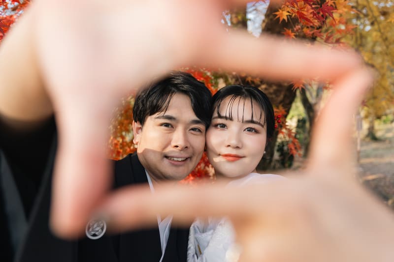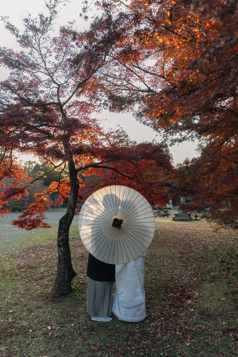 紅葉に囲まれて夕日の中で、寄り添うお二人がとても素敵な和装のフォトウェディングです。お二人のご希望やアイディアも教えてください。ブーケを使ったり、自分でフレーミングしてみたり、お二人のご希望をいろいろ教えてくださいね。