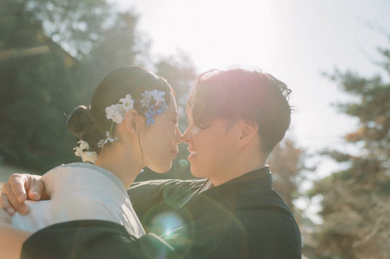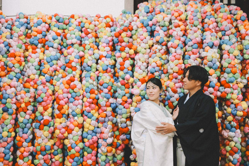 色とりどりの背景だからこそ白無垢と紋付き姿のお二人に自然と目がいきます