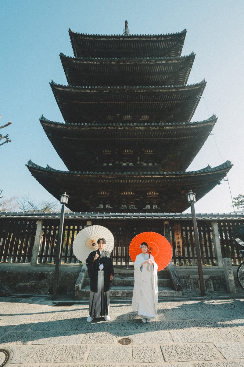 お次は和傘をお持ちいただき五重塔の前でパシャリ