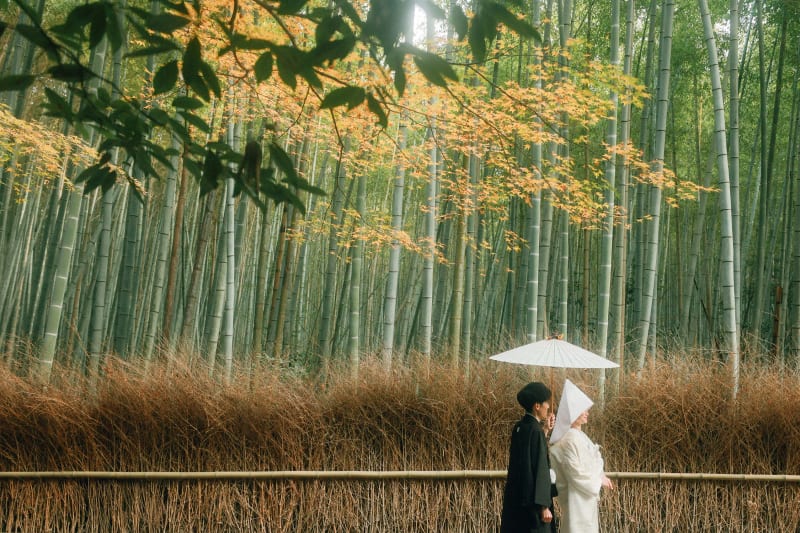 美しい緑の中で和傘をさして歩くお二人がより一層映える1枚