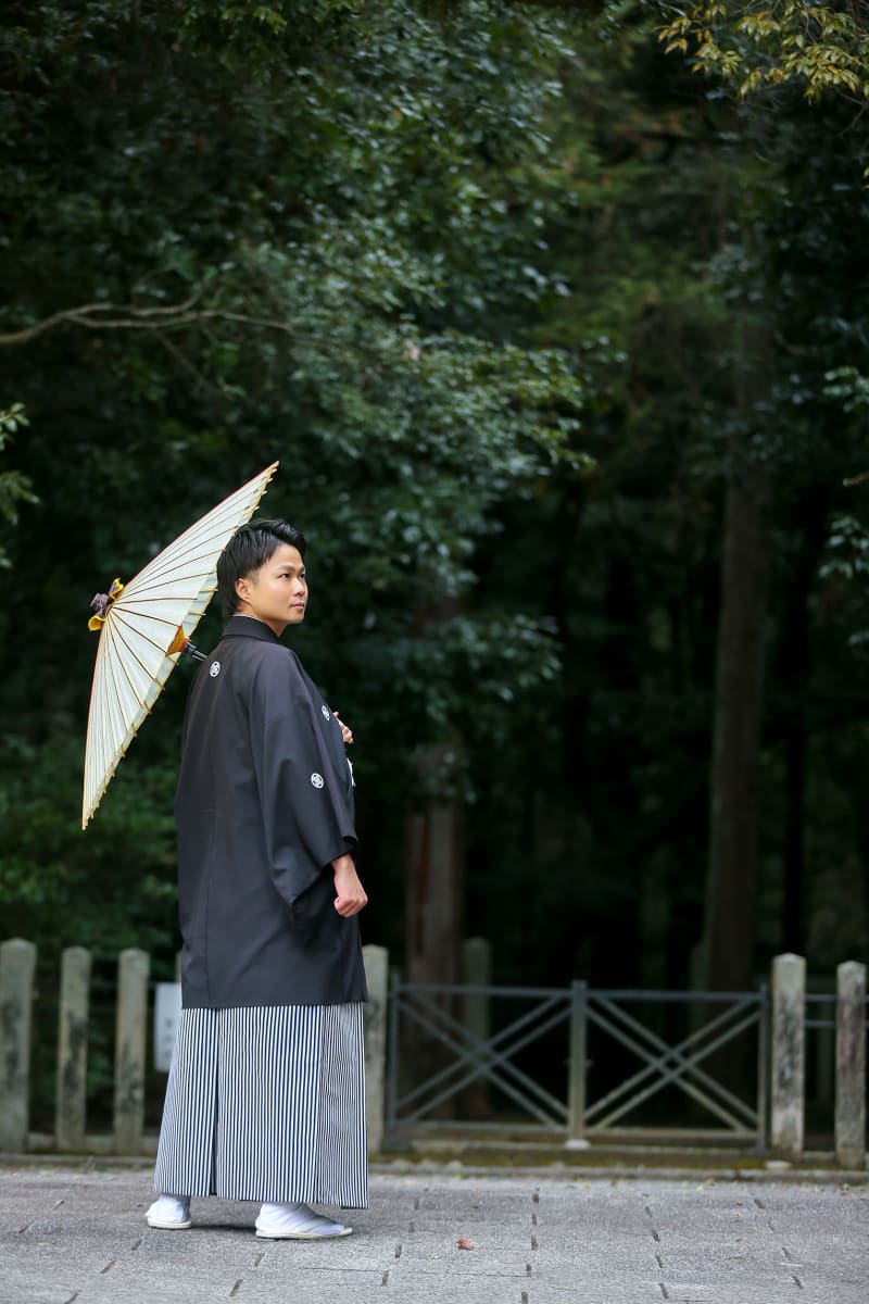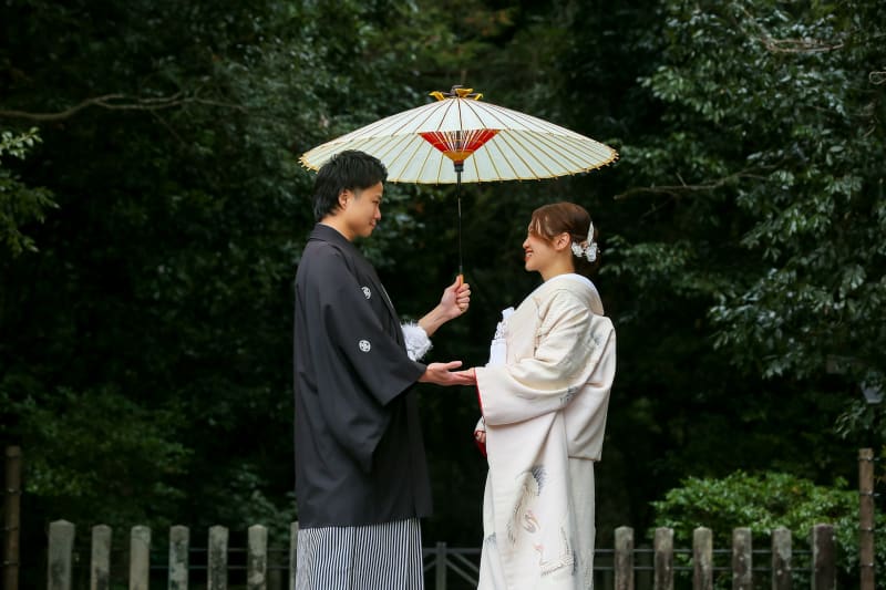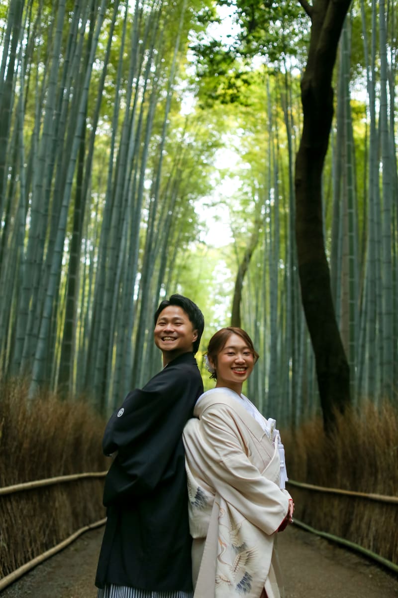 嵐山の竹林の中から撮影スタート。和装のフォトウェディングに雰囲気もぴったりですね!
