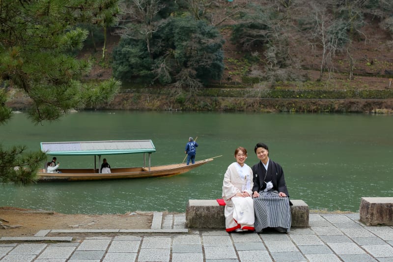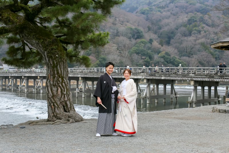 嵐山をお二人仲良く散策しながらのウェディングフォト。嵐山はいろいろな撮影ポイントがありますよ。