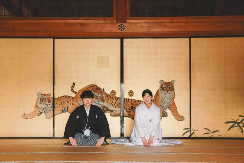 虎の模様と新郎様の黒紋付の色のバランスが調和し