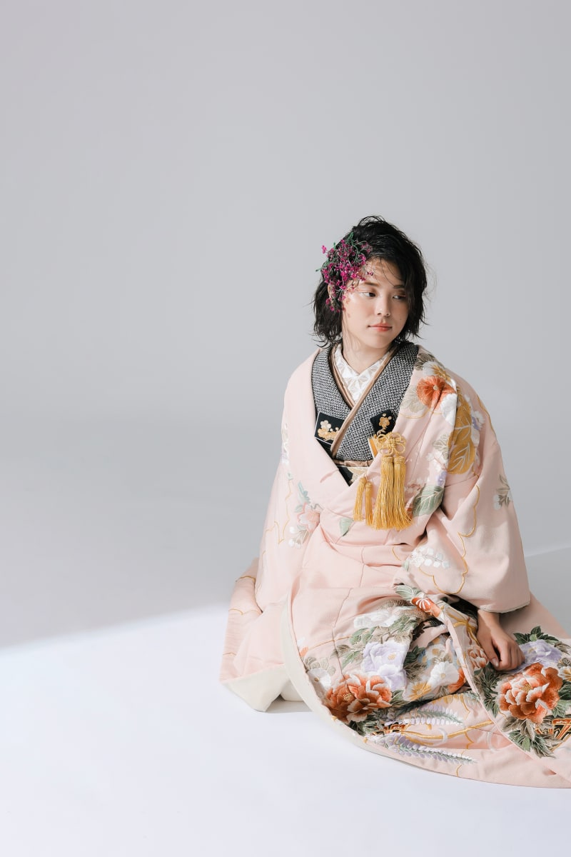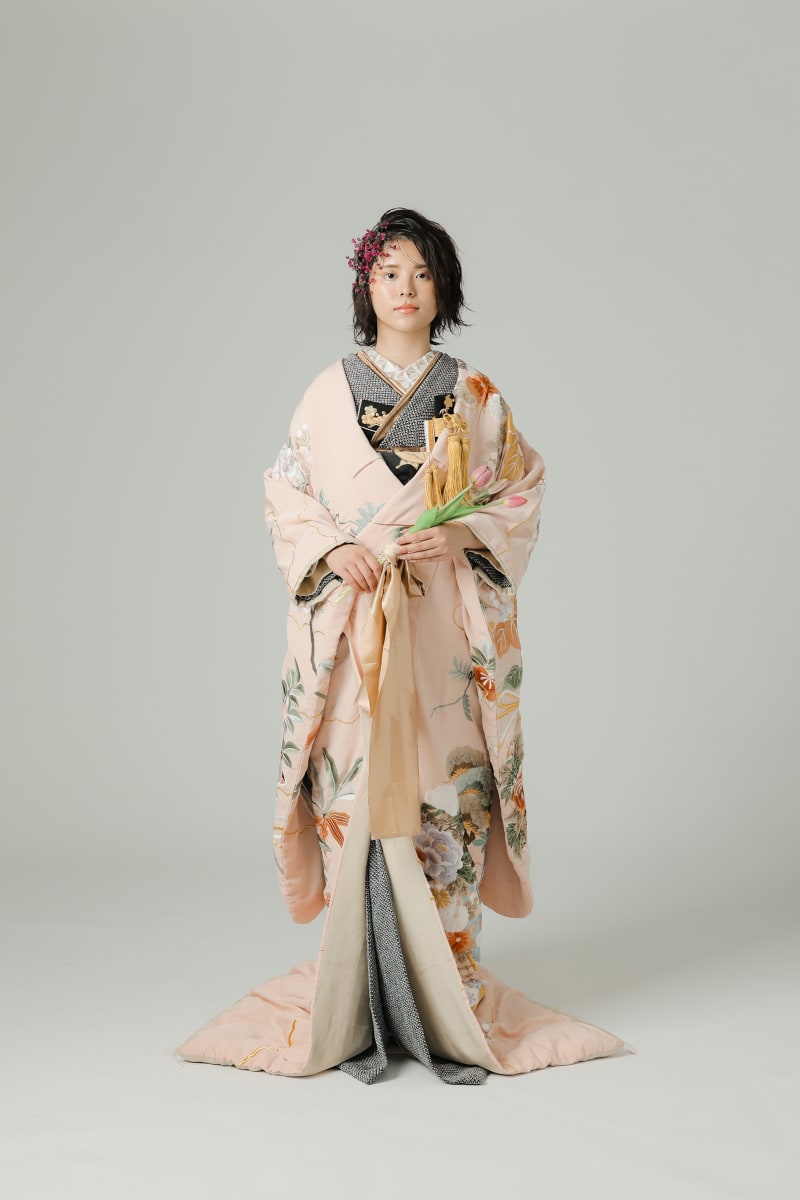 春の訪れを感じさせる優しい色の打掛の下に全体を引き締めるような黒の掛下の組み合わせで素敵です