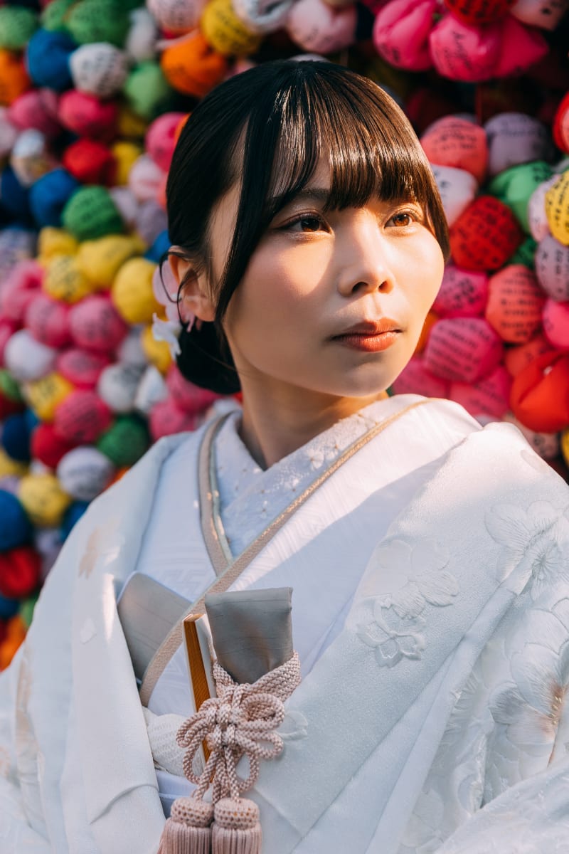 色とりどりのさるぼぼが背景にあるからこそ、新婦様の白むく姿が一層映えます