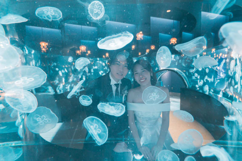 ふわふわ浮かぶクラゲたちの水槽にお二人が入り込んだようなシーンが撮影できました