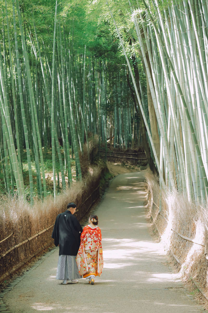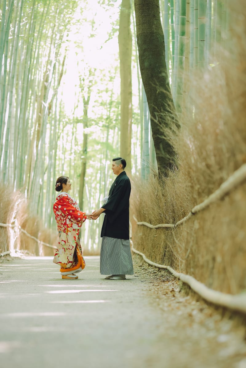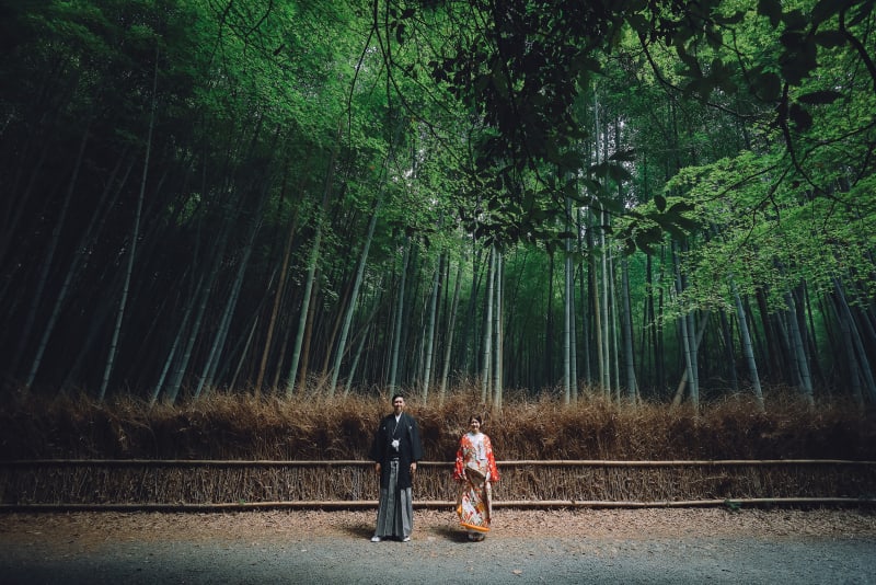 早朝の嵐山の竹林は観光客も比較的少なく、かっこいいウェディングフォトをお楽しみいただけます。