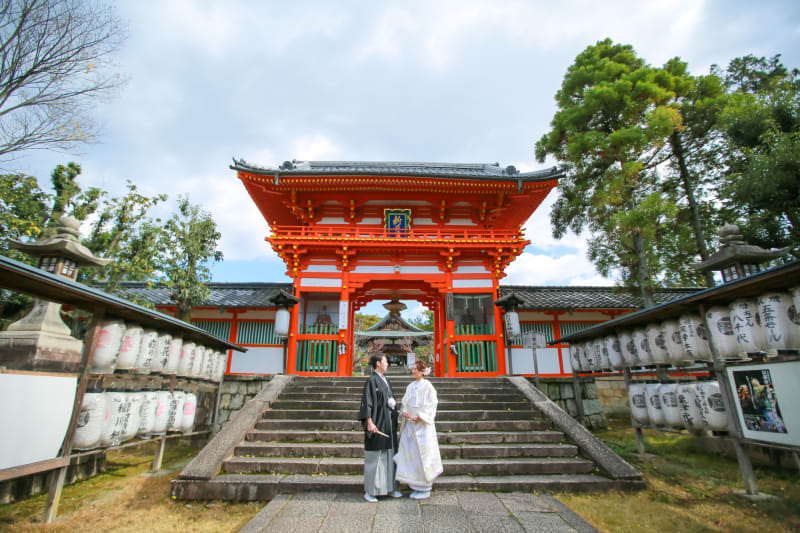 迫力ある朱色の楼門も魅力的な前撮りスポットですよ。京都らしさもたっぷりですね。