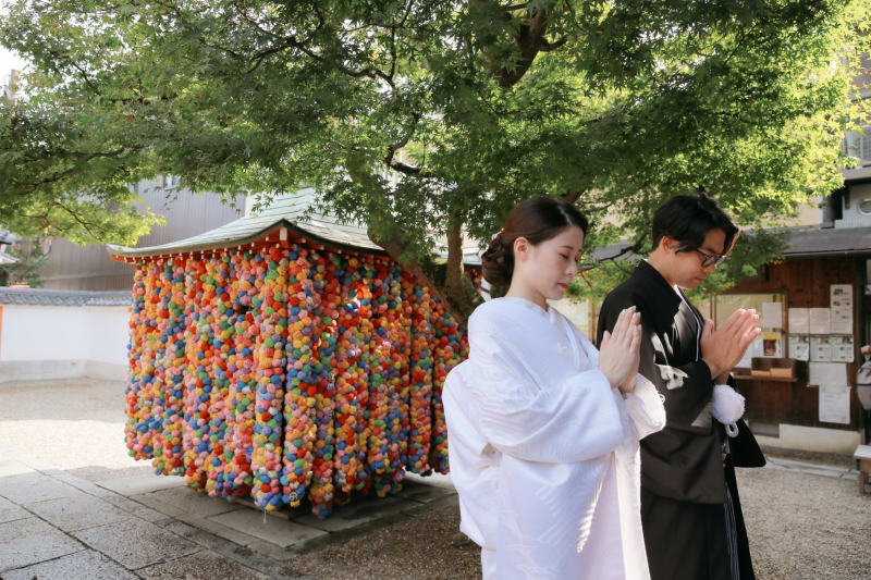 八坂庚申堂。カラフルなくくり猿を背景にすると、白無垢と紋付がより際立ち、凛として手を合わすお姿が素敵です。