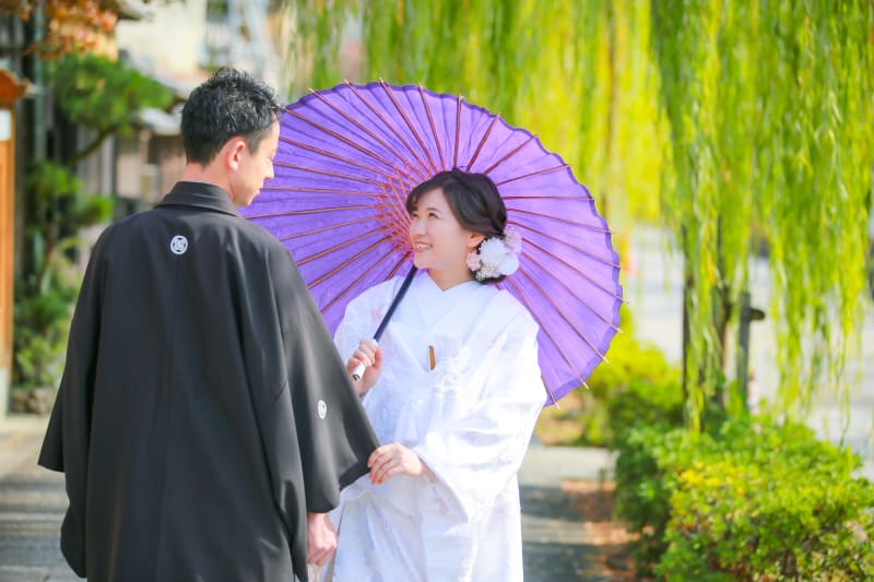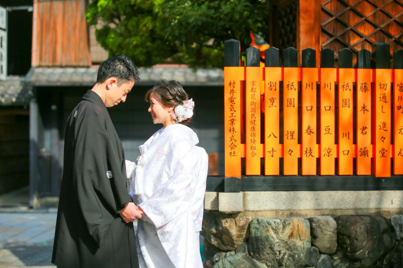 祇園での撮影は朝に行いますが、早朝ならではの静けさ、綺麗な空気の中で晴れやかな前撮りの撮影が叶います。
