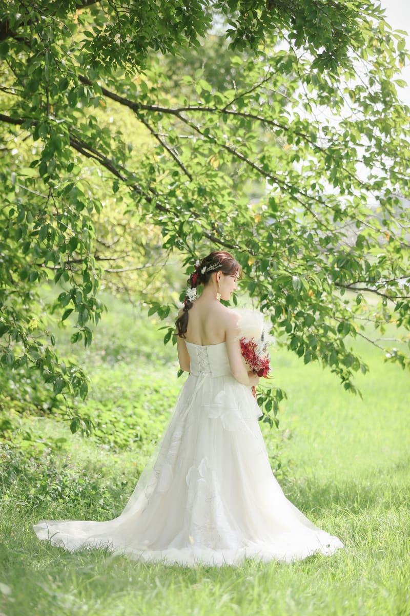 ヘアと花束の中に散りばめられた赤色がいいアクセントになっています♪