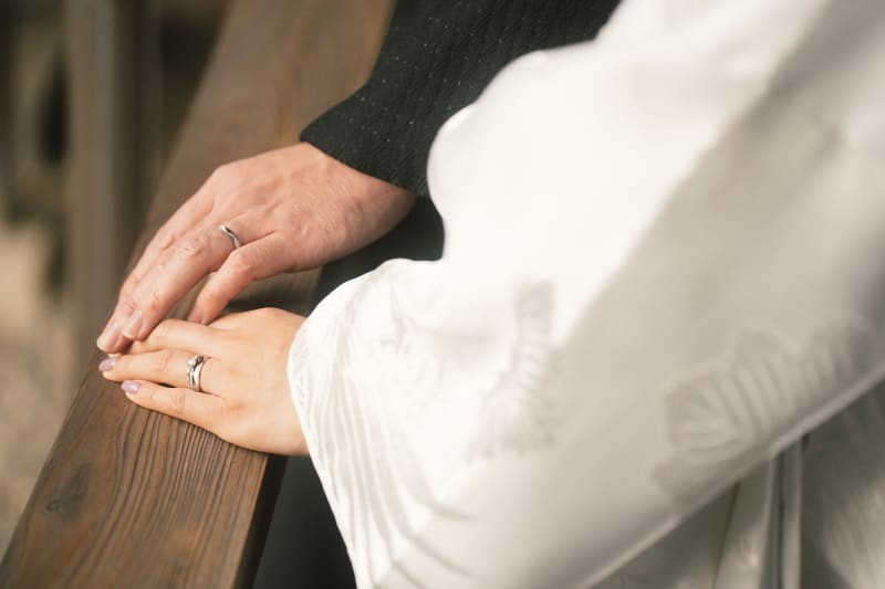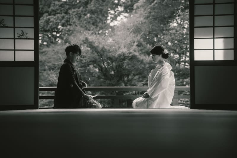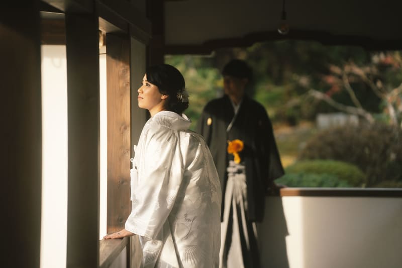 屏風の光のグラデーションが白無垢の美しさを引き立てます。