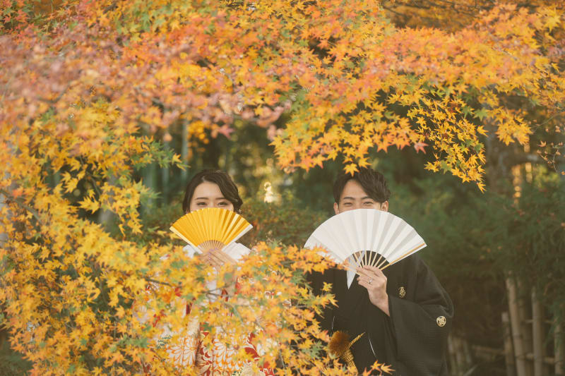 紅葉の色の移ろいはもちろん、背景にうつる緑のキラキラ感もポージングとぴったりです♪