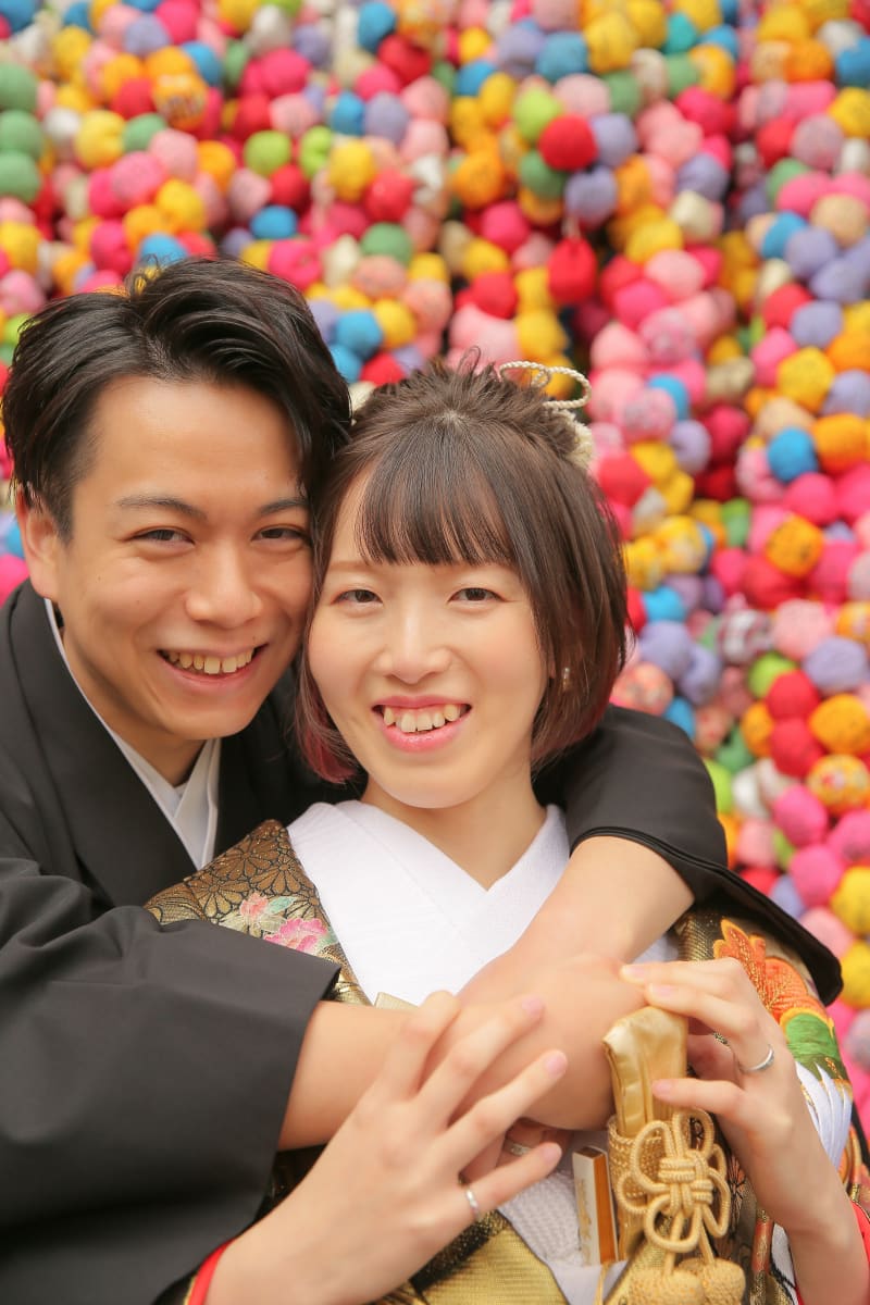 カラフルな背景がふたりを祝福してくれているような感じがしますね!
