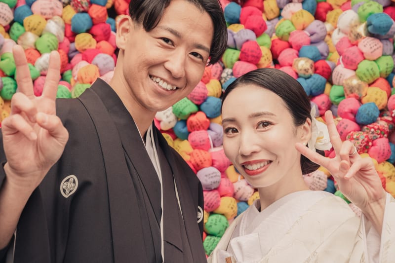 カラフルな背景が、おふたりの笑顔を更に引き立てているように感じます♡笑顔も素敵です◎