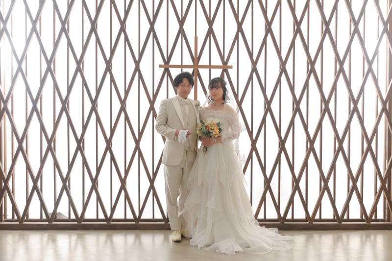 結婚式当日のチャペル前で撮った雰囲気のある1枚