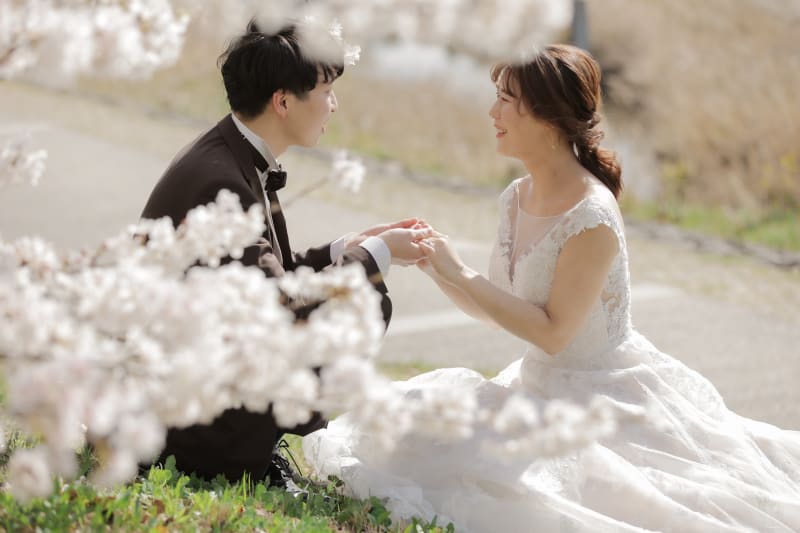 桜の間から見えるおふたりの世界。ひだまりの中、ピクニックに来ているような仲睦まじいお姿です♪