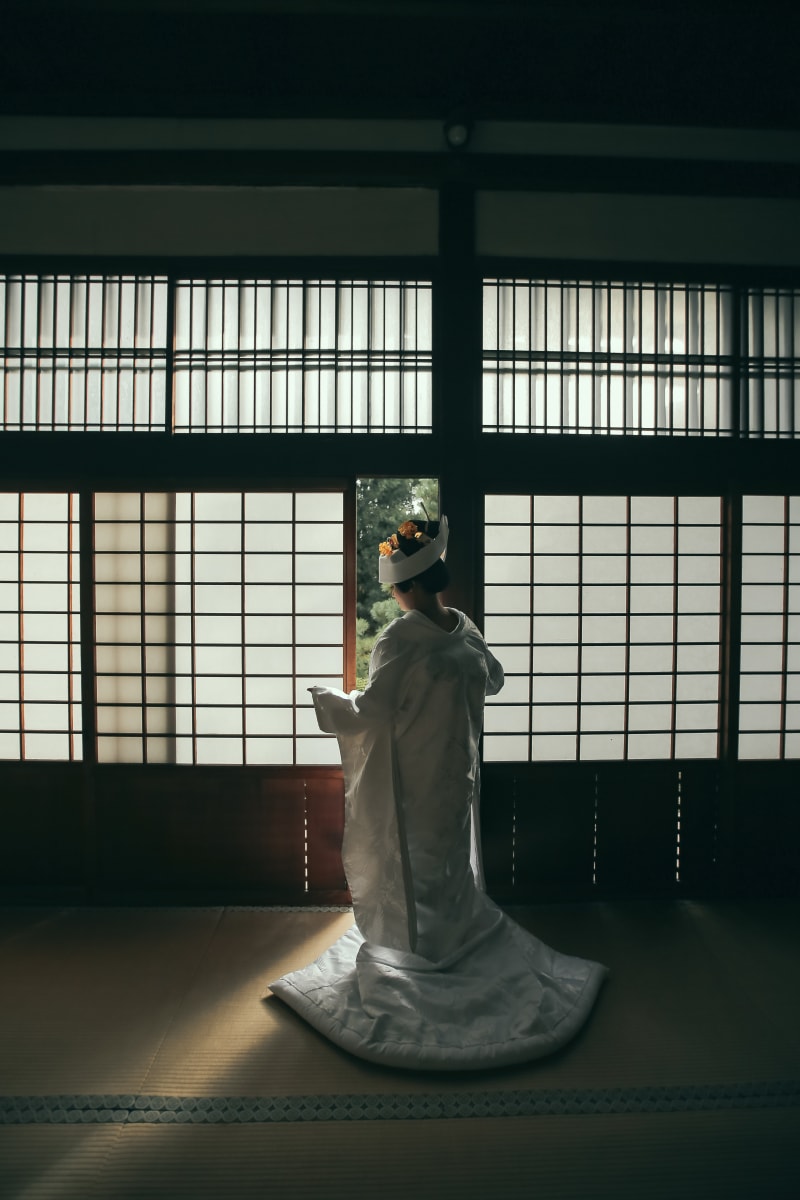 ご新婦さまは鶴と桜柄の白無垢に洋髪ではなく鬘に角隠しのスタイルをお選びになりました。