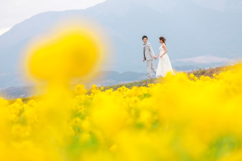 鮮やかな菜の花を楽しみながら、可愛いウェディングドレスにおしゃれなタキシードでの、ウェディングフォトはいかがですか?