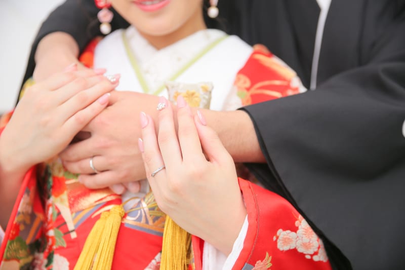 手元のショットでさりげなく指輪と新婦様のキレイなネイルも撮れますよ。