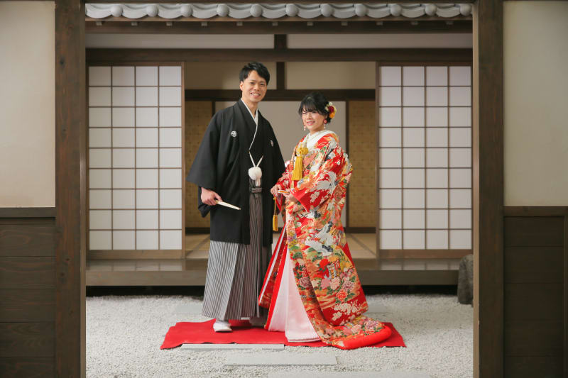 新婦様は赤の古典柄の色打掛、新郎様は黒の紋付袴でした。