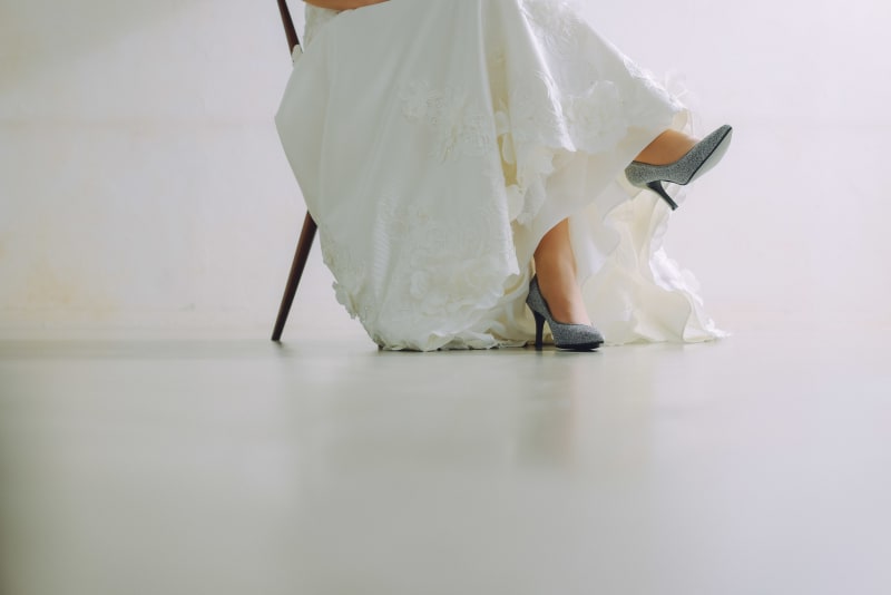 トレーンで隠れがちなお足元も、こうして椅子にかけ、シンプルな背景で撮影すると