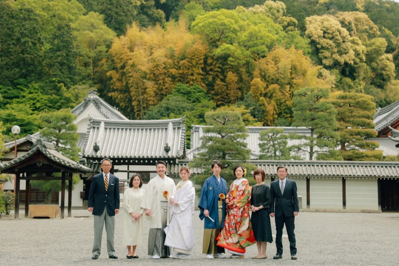 緑いっぱいの中に白無垢と白の紋付袴が映えますね✨