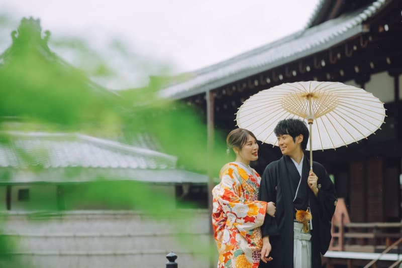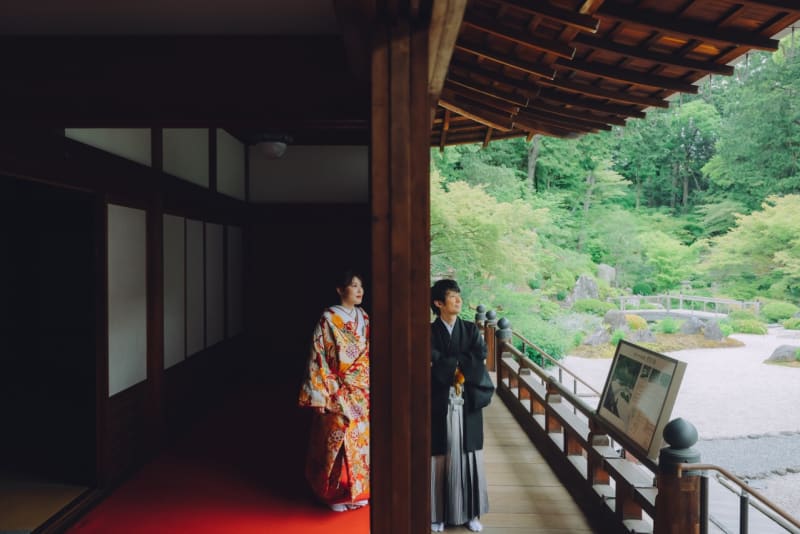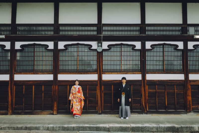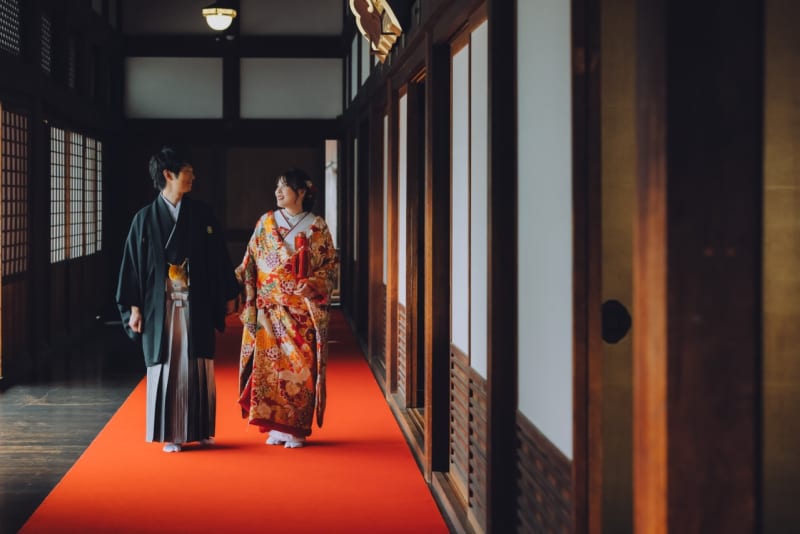 背景でより色打ち掛けと紋付袴を着ているお二人が映えますね♪