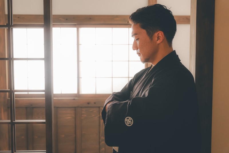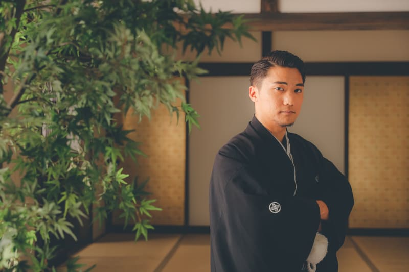 今度は、目線を下へ横からのショットです♪中庭からの光と紋付の締まる色がマッチしていますね!!