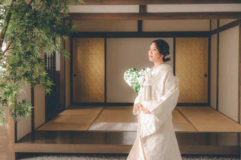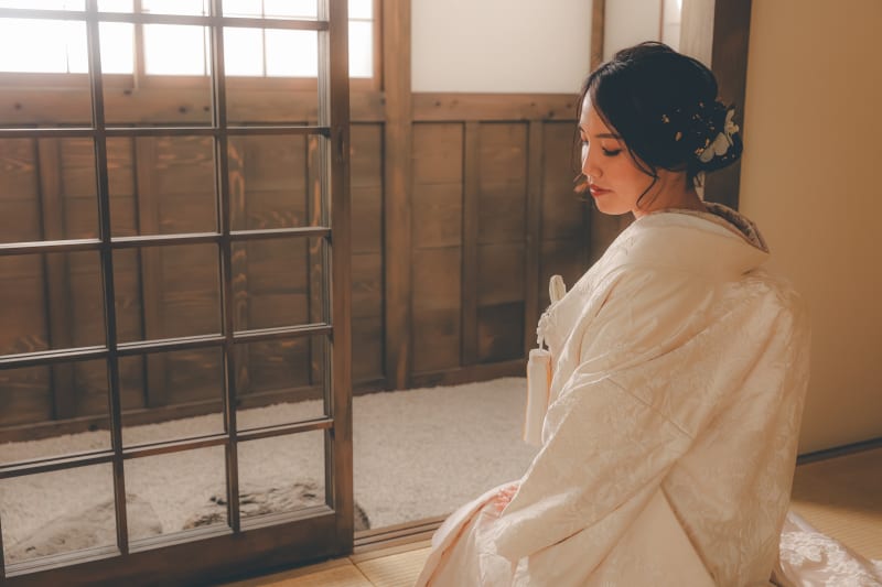 庭園の縁側でのお写真。光が白無垢に反射して艶やかさが増しています♪立ち姿も凛としていて綺麗ですね♡