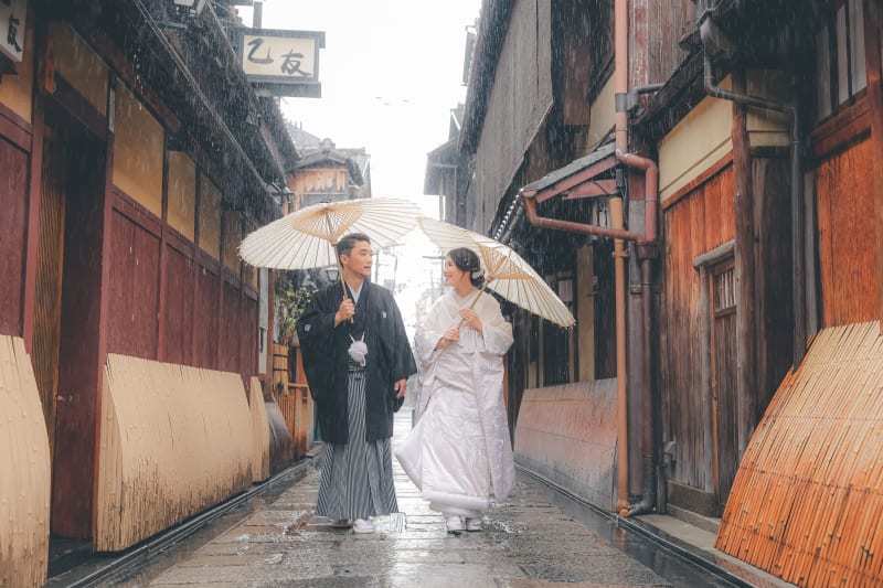 雨がよく降った1日。八坂の街並みは静かなので、しとしと雨の音が響いていたのでは?こちらも絵になるおふたり♡