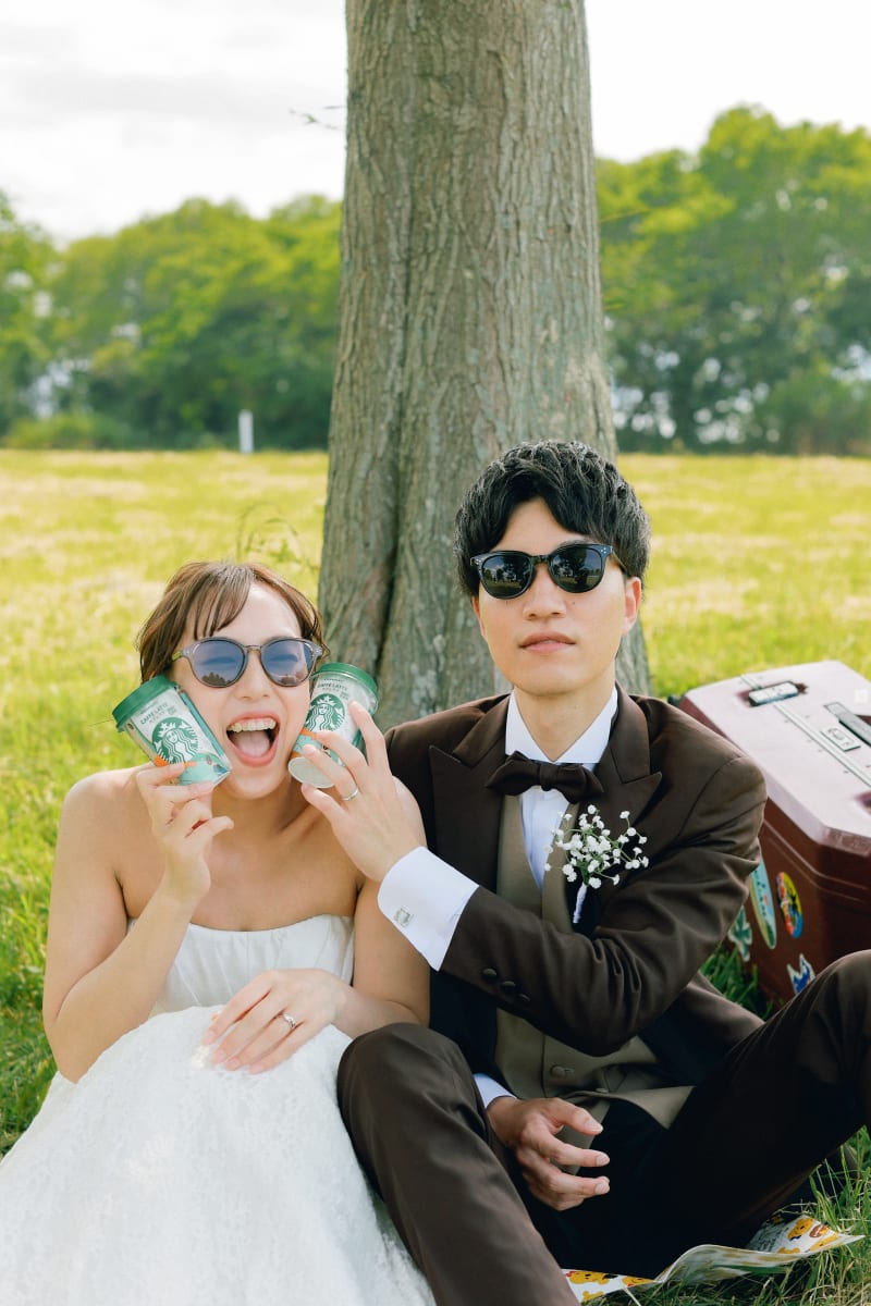 シートを敷いて大好きなスタバのコーヒーを持てばピクニックに来たような気分に♪おふたりの仲の良さが伝わってきます♪