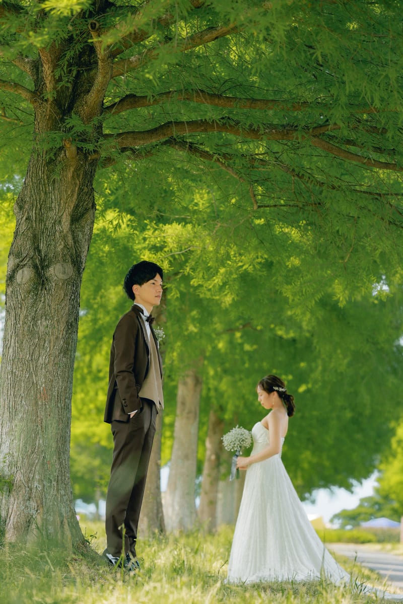 芝生と木陰がある中に、自然に溶け込むおふたり。初夏を感じるお写真になりました♪