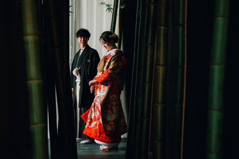 光と影を使って色打掛のお色味が綺麗に映し出されたシックな一枚です。
