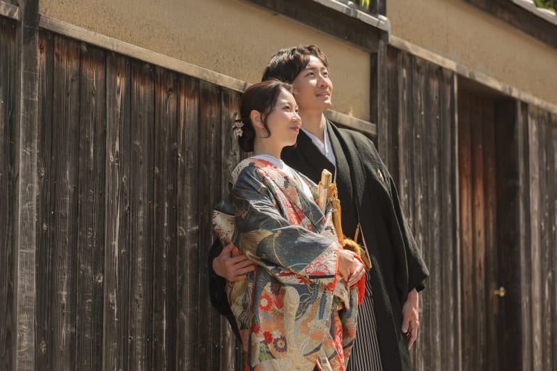 綺麗なお色の色打掛がよくお似合いの新婦様と紋付袴がかっこいい新郎様♡