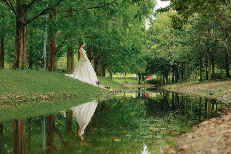 水面に映る新婦様も含めて綺麗なショット♪自然の中に溶け込む新婦様がキラキラして見えますね♪