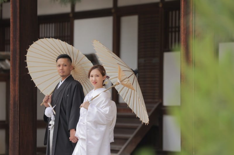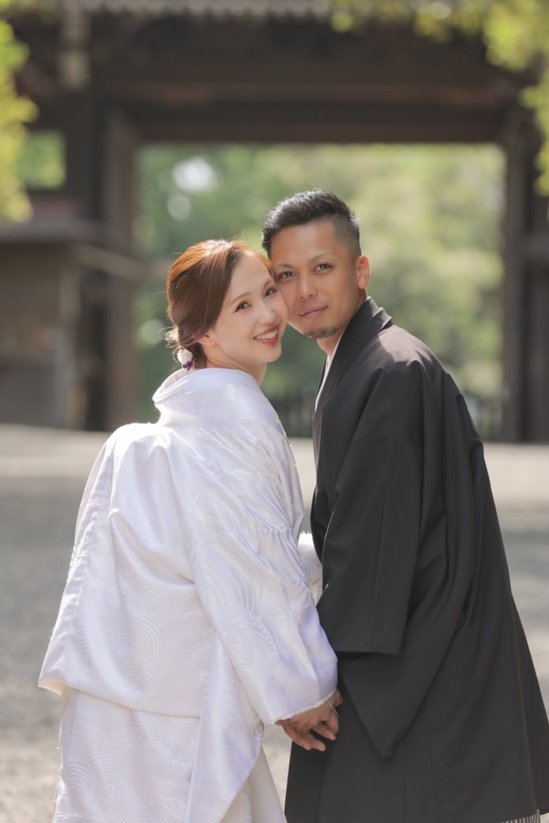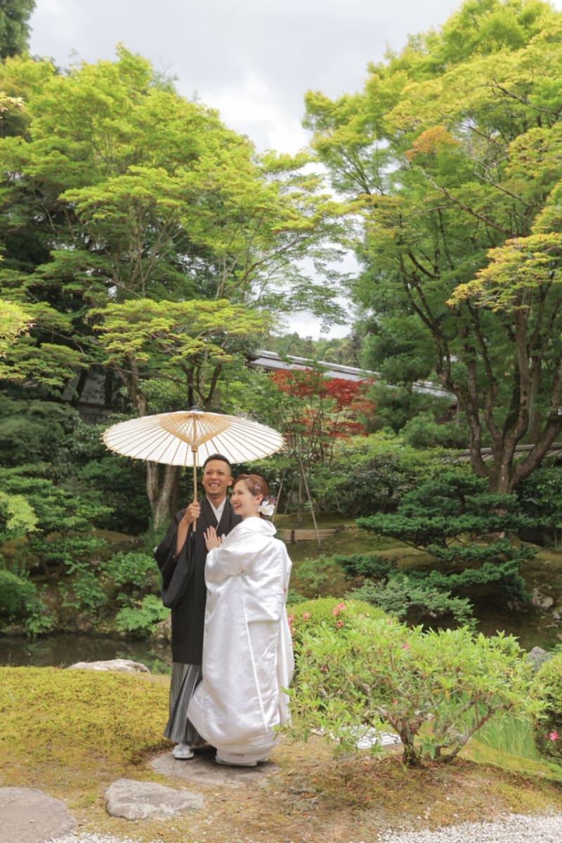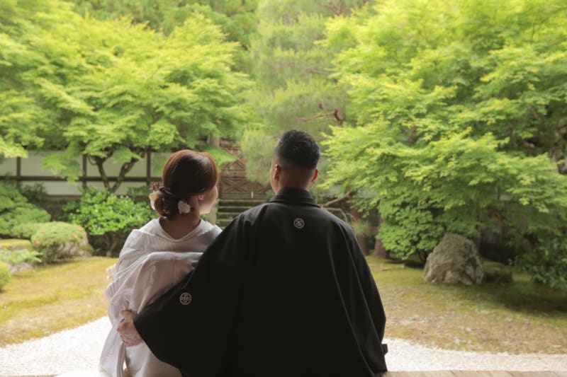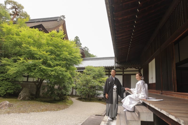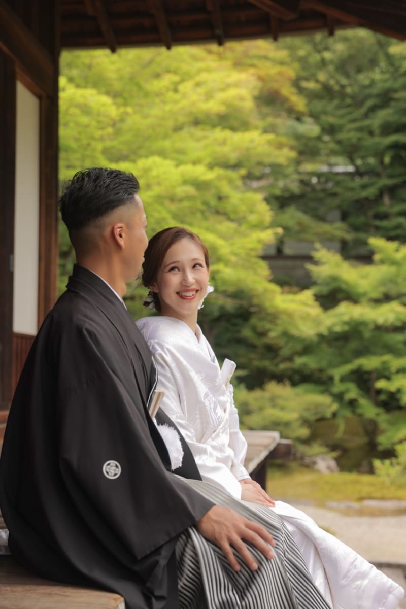 泉涌寺の新緑は、緑いっぱいで、京都らしさもありながら二人だけの空間で撮れる場所かなと思います。
