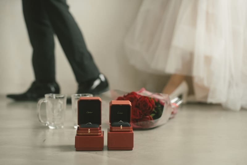 輝く指輪たちの後ろで、おふたりの足元が映るだけでも絵になります♪