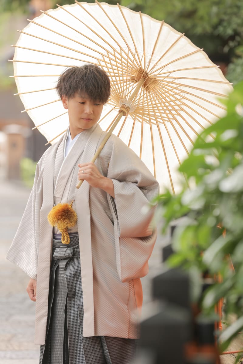 番傘を片手に佇む新郎様。番傘を持つ手の指輪がキラキラ輝いていますね♪