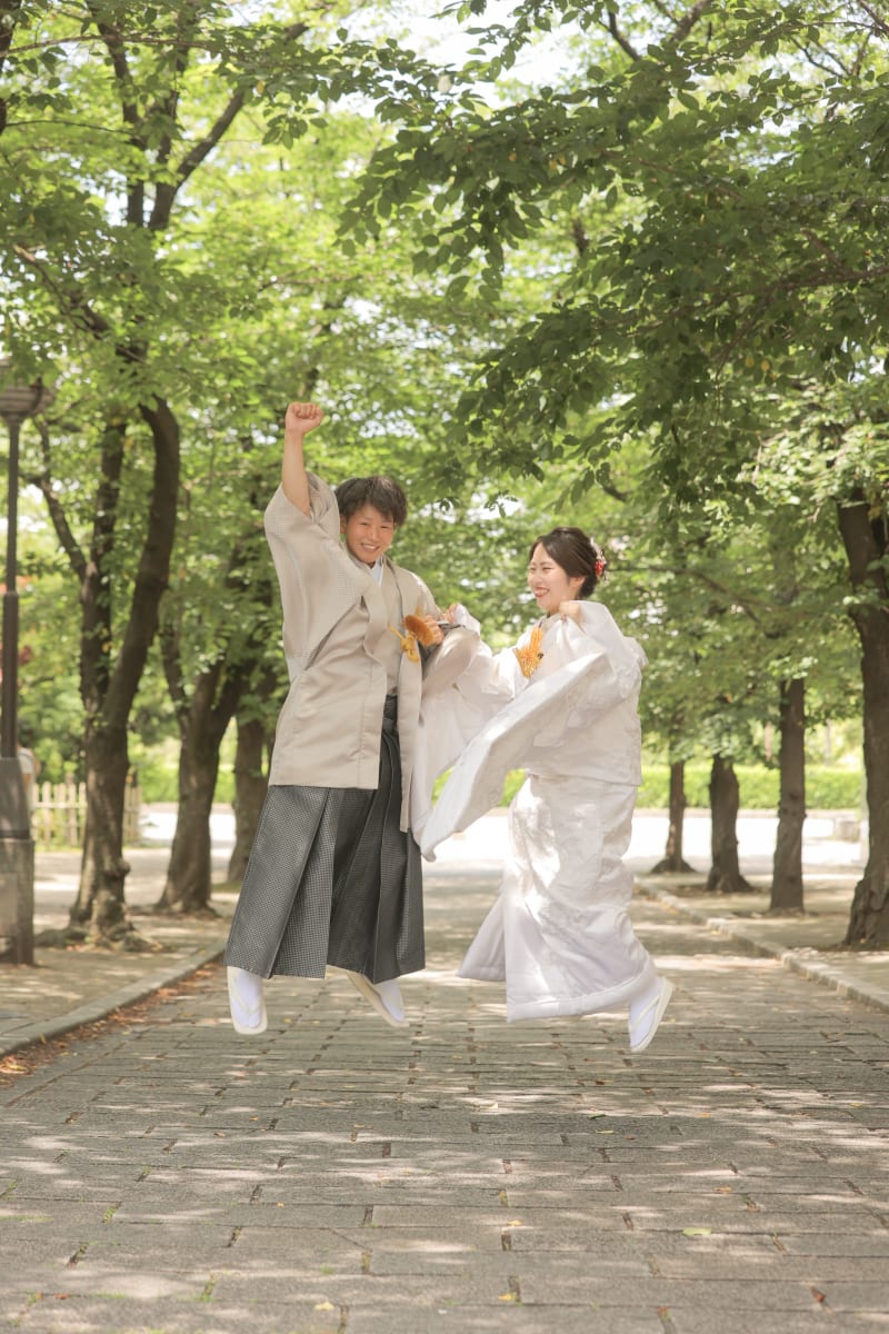 番傘をさして仲睦まじい様子が伝わってきますね!新婦様の髪飾りもアクセントになっていて可愛いですね♡