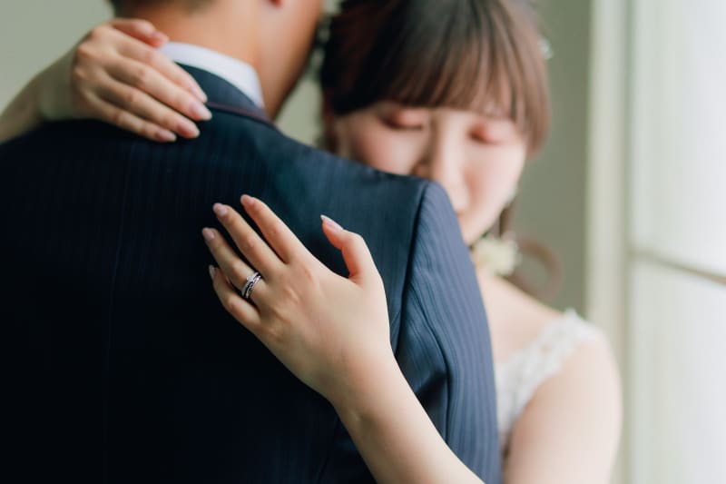ふたりがハグするお姿をあえて、指輪にフォーカスをあててのお写真に♪